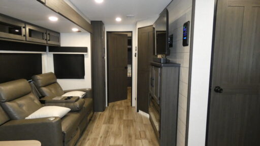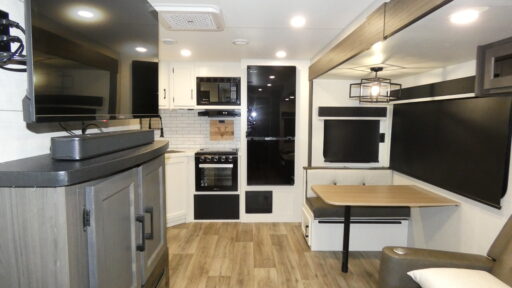This travel trailer is perfect for two people who want to escape from everyday life! The front private bedroom has a 70" x 80" Sleep Tight king bed slide for more interior space, a dresser with a 30" frameless fireplace and TV, and a window seat to read a book with a view. Freshen up each morning in the full bathroom with the 30" x 36" shower then head to the rear kitchen to fry up some eggs on the three burner cooktop. The Sit N' Slide table offers a comfortable place to enjoy your meals, play card games, and even transform into an extra sleeping space. Grab a snack from the walk-in pantry and relax on the 70" tri-fold sofa across from the entertainment center with a 30" frameless fireplace!