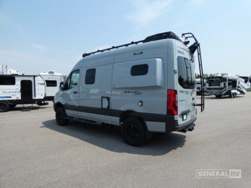 Go off-grid and off the beaten path with the Revel Sport Class B diesel motorhome by Winnebago. There is a 5kWh EcoFlow battery, 210-watts of solar power, plus a 5-in-1 Winnebago x EcoFlow Power Hub Pro with a 3,600-watt inverter, solar charger and more features to keep you powered up! This camper van sits on the durable Mercedes-Benz AWD sprinter chassis with a 2.0L high-output turbo-diesel engine. You will also find a MBUX touchscreen multimedia infotainment system, heated cab seats, plus added safety features, such as active braking assist and blind spot assist. The interior of the Revel Sport is outfitted with heavy duty vinyl flooring throughout to withstand your adventrous lifestyle, and there are RAM Tough-Track mounts throughout to keep your gear secure. Additional features include a hydronic heating system, aluminum running boards with ground effect lighting, a 5,000 lb. trailer hitch, and so much more!