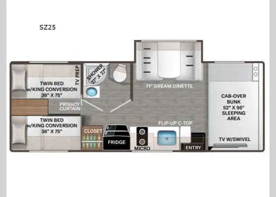 It won't be hard to find comfort in this coach for five! You can freshen up in the mid-coach full bath once you've set up camp, then make lunch on the two burner gas cooktop or convection microwave with an air fryer. There is also a 12V refrigerator for cold items and a flip-up countertop for more space. Whether you dine at the Dream Dinette slide out or take your plate outdoors under the 17' 6" power awning, you're sure to have a great time in this motorhome. The semi-private rear bedroom includes a privacy curtain, two twin beds with a king-size bed conversion, plus TV prep if you want the option to watch shows in bed. And any guests you may have can sleep on the dinette and 52" x 96" cab-over sleeping space! With any Pasadena SE Class C gas motorhome by Thor Motor Coach, you will find convenient amenities, a modern interior, and a reliable Ford E-Series chassis, with an optional Chevy chassis on select models to power your adventures. There is a one-piece fiberglass front cap, and premium one-piece roofing for added strength. Residential vinyl flooring will be easy to keep clean, and you'll love the LED lighting, pressed laminate countertops throughout, and full-extensions ball-bearing drawer guides. These motorhomes also include a 4.0 kW gas generator and a 30-amp shoreline power cord to keep you going, along with a tankless water heater to ensure your comfort!