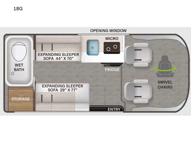 Thor Motor Coach Rize Class B gas motorhome 18G highlights: Rear Wet Bath Leatherette Swivel Captain's Chairs Expanding Sleeper Sofa 44" x 70" Thule Power Awning Microwave Oven Travel easily in this Rize 18G motorhome. When you are ready to get off the road for a few hours or several days you will have plenty of comforts to enjoy before you head to your next location. The expanding sleeper sofa offers plenty of seating during the day and additional seating can be found opposite with each seating area offering one set of seat belts for two rear travelers. Create meals on the go with a two-burner gas cooktop and microwave oven, you can dine while seated in one of the captain's chairs that swivel, or from the seating in back. Create a 44" x 70" sleeping space at night with the expanding sofa along the curbside. The large opening window above the sink and stove will provide plenty of fresh air throughout, and the wet bath in back is a convenience that you just can't beat while on the road or in camp! The Rize Class B gas motorhome by Thor Motor Coach allows you to experience the camping lifestyle in a compact RV packed with convenient features. There is a 3.6L Pentastar V6 engine and 276 HP to power your excursions, and the outdoor enthusiast will love the exterior sprayer. Each model includes residential vinyl flooring, Welformed interior wall panels, Euro-style upper cabinet doors, and cassette shades. You'll find solid surface countertops in the kitchen and a glass protective cover and task lighting above the cooktop to easily cook meals each day. The keyless entry system adds to the convenience found throughout these models, plus there is an exterior LP connection if you want to hook up your own grill!