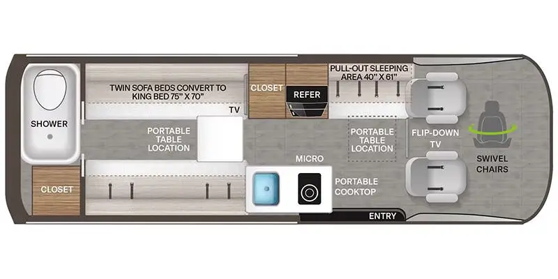 Experience the ultimate adventure with the 2025 Thor Motor Coach Tranquility 24A. Built on the reliable Mercedes-Benz Sprinter 3500 chassis, this RV combines luxury and functionality. As you enter, you'll find a thoughtfully designed space with a front living area featuring swivel chairs and a flip-down TV, perfect for relaxation after a day of exploration. The center kitchen is equipped with a portable cooktop and mid-size electric refrigerator, ensuring you can prepare your favorite meals on the go. The rear of the Tranquility 24A offers a spacious bathroom with a shower curtain for privacy, while the twin sofa beds effortlessly convert into a king-sized bed, ensuring a restful night's sleep. With a pull-out sleeping area and ample storage, including closets and portable table locations, this RV is designed to maximize comfort and convenience. The 14 ft. powered retractable awning creates an inviting outdoor space, perfect for enjoying the view. Whether you're embarking on a cross-country journey or a weekend getaway, the Tranquility 24A is your perfect travel companion. For more information, visit your nearest General RV dealership.