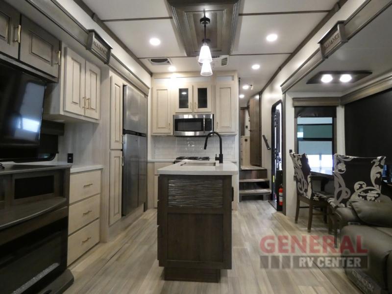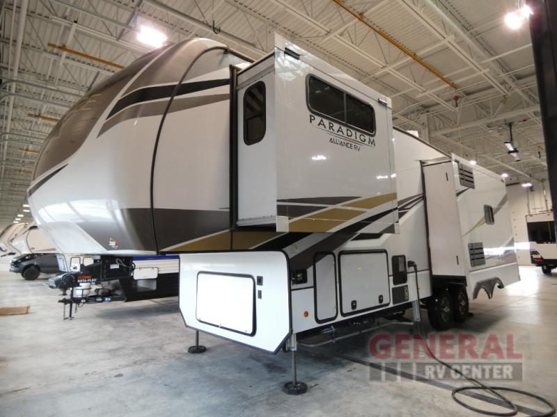 Discover the 2024 Alliance RV Paradigm 295MK, where luxury meets practicality in a compact yet spacious design. This fifth wheel is perfect for families or couples seeking adventure without sacrificing comfort. With a length of just over 33 feet, it offers a versatile living space that includes a rear living area featuring a dual recliner love seat and a sleeper sofa, ideal for relaxation or entertaining. The center kitchen is equipped with a full-size refrigerator and a four-burner cooktop, making meal preparation a breeze. The elegant floating dinette table adds a touch of sophistication, while the pull-out fireplace storage and 50" class smart TV ensure cozy evenings indoors. Retreat to the front bedroom, where the king bed promises restful nights, and enjoy the convenience of washer and dryer prep. The center bath features a spacious 48"x30" shower, providing a refreshing start to your day. With three slides, this RV maximizes interior space, and the powered retractable awnings extend your living area to the great outdoors. Ample storage, including a flip-top dresser and seat with storage, ensures that all your travel essentials are neatly tucked away. Experience the perfect blend of style and functionality with the Paradigm 295MK. For more information or to see this model in person, visit your nearest General RV dealership.