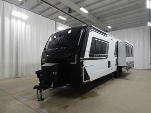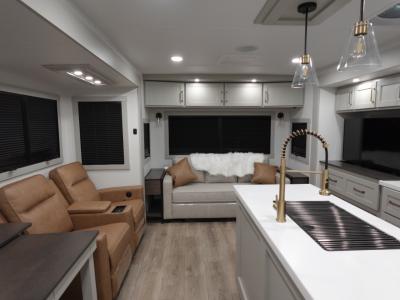 Brinkley Model Z Air travel trailer 297 highlights: Kitchen Island Theater Seating One-Piece Fiberglass Shower Queen Bed Drop-Frame Pass-Thru Storage This travel trailer is spacious thanks to the dual opposing slides in the combined kitchen and living area. There is a rear 72" tri-fold sofa here, theater seating, and a sliding desk/dining table. The televator and fireplace will let you relax each evening with a movie or good book, and the full kitchen lets you make meals wherever you go. The chef of your group will also appreciate the pantry with adjustable shelving for all their ingredients, a hutch, 30" residential microwave, and even a pull-out trash bin for easy clean-up. When you're ready to call it a night, the front private bedroom will be waiting for you. This room includes a queen bed with four underbed drawers, a closet with pass-thru access to the bathroom closet, plus washer and dryer prep if you want the option to go full-time! With any Model Z Air travel trailer by Brinkley, you will enjoy premium features at every turn. The industry-first low maintenance roof is sure to be appreciated, plus there are industry-first brass plumbing connections for excellent resistance to corrosion. The drop-frame chassis with ample exterior storage will allow you to bring along camp gear galore, plus there are motion lighting and power outlets for added convenience! You'll also find two hot/cold showers outdoors, along with a 370-watt solar panel, a custom LP box with locked battery storage, and a premium utility center with a retractable 65' water hose to wash off mud from the lake. The interior is just as accommodating with its solid surface countertops, Brinkley CraftSense wood trim construction, integrated window screens and insulated blackout blinds, and the list of luxury features goes on!