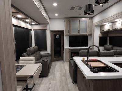 The 2022 Grand Design Momentum 395MS is a luxury fifth-wheel toy hauler built for those who want high-end comfort and serious hauling capability. Measuring over 44 feet long, it features a 14-foot garage with Happi-Jac bunk system, rear ramp patio, and optional half-bath, making it perfect for bringing along ATVs or other gear. Inside, the living area includes dual slide-outs, theater seating, an entertainment center, and a modern kitchen with a 20 cu. ft. refrigerator and solid surface countertops. The front master bedroom offers a queen bed (king optional), slide-out wardrobe, and access to a full bathroom with a walk-in shower and teak bench. With triple-insulated floors, three power awnings, a 60-gallon fuel station, and robust heating and cooling systems, the Momentum 395MS is built for year-round adventure without sacrificing residential luxury.