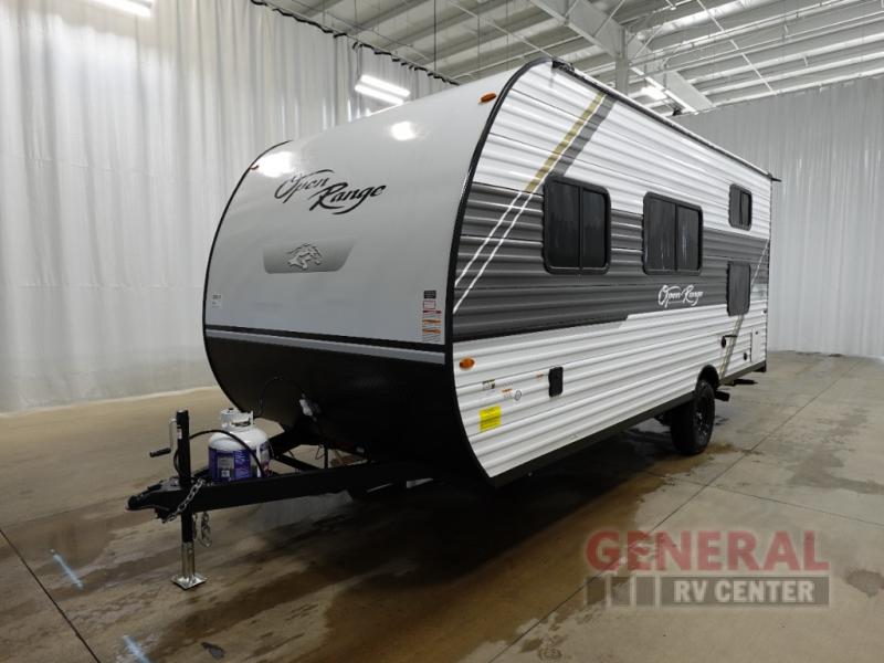 Step into the 2024 Highland Ridge Open Range Conventional 19BH, where compact design meets comfort and functionality. This travel trailer is your perfect getaway companion, offering sleeping accommodations for up to six adventurers with a cozy queen bed, a convertible dinette, and two bunk beds. The center kitchen is efficiently equipped with a two-burner cooktop and a mid-size refrigerator that operates on both electric and propane, ensuring you can whip up delightful meals no matter where your journey takes you. The thoughtful layout maximizes space, providing a seamless flow from the center living area to the rear bath, where a practical shower curtain offers privacy. Enjoy the great outdoors under the 13-foot powered retractable awning, perfect for relaxing after a day of exploration. With a fresh water capacity of 20 gallons and nearly 20 gallons each for gray and black water, this RV is ready for extended adventures. Despite its robust features, the 19BH remains lightweight with a dry weight of just 3,565 pounds, making it easily towable. Whether you're embarking on a weekend getaway or a cross-country expedition, this RV offers the perfect blend of convenience and comfort, inviting you to create unforgettable memories. For more details, visit your nearest General RV dealership.