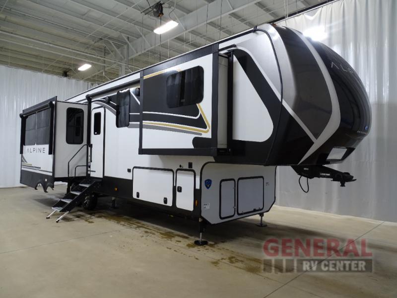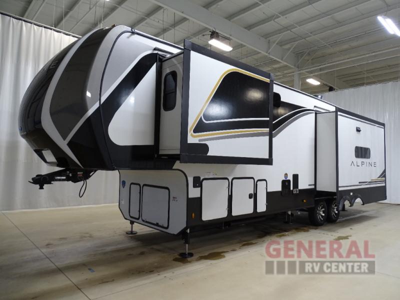 ## Keystone RV Alpine fifth wheel 3303CK highlights - Underbed Storage - Dual Bath Sinks - Kitchen Island - Rear Living Area - 18 Cu. Ft. Residential Refrigerator You will feel right at home camping in this fifth wheel! The chef will have lots of countertop space to prepare their best meals along with a kitchen island, two pull-out pantries to store your dishes, and a 18 cu. ft. residential refrigerator to store any leftovers. The free standing dinette offers a comfortable place to enjoy your meals, and the theater seating across from the fireplace and entertainment center will be perfect for movie nights. There is also a rear hide-a-bed sofa sleeper for any guests you may have. You will love the full bath that includes a shower with a seat, a linen closet, plus two bath sinks for convenience. And don't overlook the front bedroom with a stylish barn door, king bed slide out, and master closet for all your things. You'll also find stackable washer and dryer prep, two drawers, and a Smart HDTV for movies in bed. Luxury is not an option, it is a standard with each one of these Keystone RV Alpine fifth wheels! A 8' 4" wide body construction will create an open, residential feeling, and cutting-edge technology will provide a hassle-free camping experience. The Tru-Fit slide construction is more durable and minimizes motor structural stress, as well as resists leaking, and the Blade Pure airflow system provides residential comfort with its high-performance. Each fifth wheel includes designer flooring throughout, stunning solid wood cabinet doors, luxurious crown molding, and solid surface countertops in the kitchen. The SolarFlex Protect 200 comes standard or you can choose the optional SolarFlex Discover 440i for even more off-grid capabilities. The exterior also includes an outside shower with hot and cold water, Lippert strut assisted SolidSteps, Hitch Vision with LED lighting, and many more conveniences!