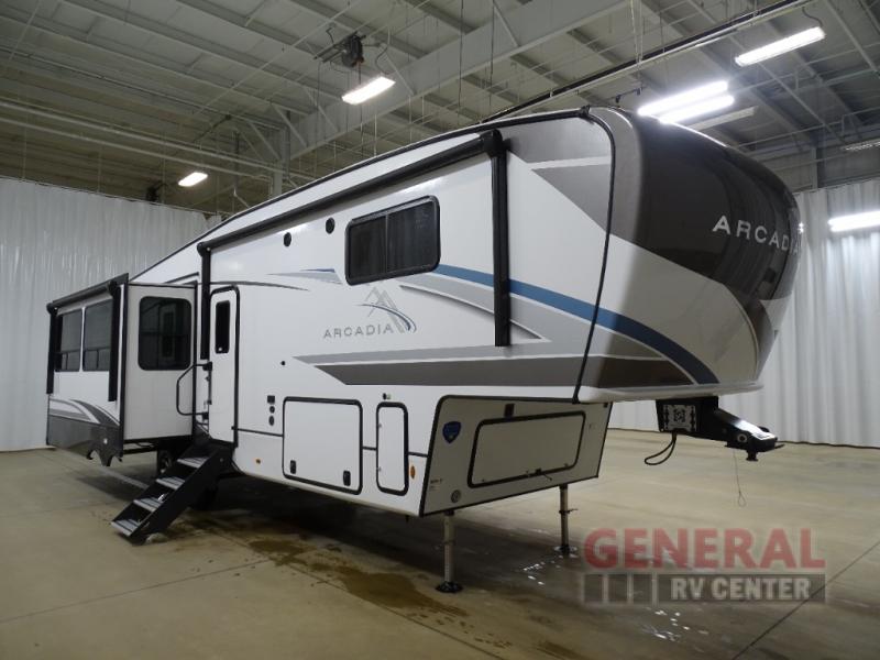 ## Keystone RV Arcadia fifth wheel 3140RK highlights - Kitchen Island - Front Private Bedroom - Theater Seating - Two Awnings - Fireplace This triple slide Arcadia is a great couples coach. The rear kitchen area features a pantry and hutch along the back wall, and there is a handy kitchen island that the cook will appreciate, plus so much space thanks to dual opposing slide. The 16 cu. ft."Solar Friendly" refrigerator with dent resistant doors is big enough to bring all of your favorite foods to cook and you will enjoy the residential microwave and solid-surface countertops, plus easy-clean backsplash as well. There is a front private bedroom with a California king bed slide for a comfortable nights rest and across from it a dresser with hidden storage and a bench seat, plus you have a front closet with wrap around shelving and is prepped to add a washer and dryer. Freshen up in the full bathroom with the 48" x 30" shower then head to the living area to find theater seating or asofa sleeper while you enjoy your morning coffee in front of the fireplace and watch the morning news on the 50" TV. Each Arcadia 3/4 ton fifth wheel by Keystone includes a Revolutionary NGC2 Next Generation crawlspace chassis, a SpaceSaver upper deck design, and a Curt equalization suspension system for a smooth towing experience. You will find abundant storage space throughout, residential Roman shades with black-out backing, designer vinyl flooring throughout, and custom cabinetry with solid wood and painted cabinet doors. Each model includes the exclusive Blade Pure high-performance air handling system for increased A/C airflow, along with a 35K BTU high output furnace so you can camp all year long. The Arcadia is constructed with fully laminated, aluminum framed one-piece sidewalls, an automotive-grade fiberglass exterior, plus an automotive-gradefiberglass front cap with KeyShield protection to keep your fifth wheel looking sleek for years to come.