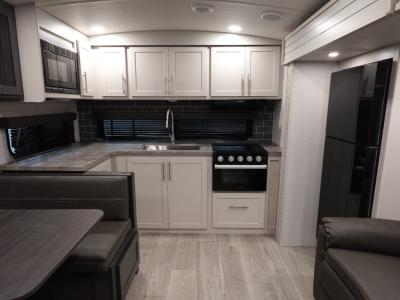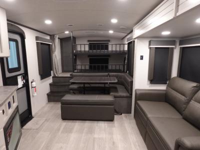 Experience the perfect blend of comfort and convenience with the 2025 Keystone Cougar Half-Ton 23MLE. This RV is designed to make your adventures memorable, offering ample space for up to six travelers. The inviting interior features a spacious center living area with a 68" tri-fold sleeper sofa and a cozy booth dinette, providing versatile sleeping options. The rear kitchen layout is equipped with a full-size electric refrigerator and a three-burner cooktop, ensuring you have everything needed to whip up delicious meals on the road. The front bedroom boasts a comfortable queen bed, complemented by ample wardrobe space, allowing you to unwind in style. Enjoy the convenience of a center bath with a sleek plastic and glass shower. The 16 ft. powered retractable awning invites you to relax outdoors, while the unobstructed pass-through storage ensures you have room for all your gear. With a dry weight of 7,778 lbs and a generous cargo capacity, this RV is ready for your next adventure. For more information, visit your nearest General RV dealership.