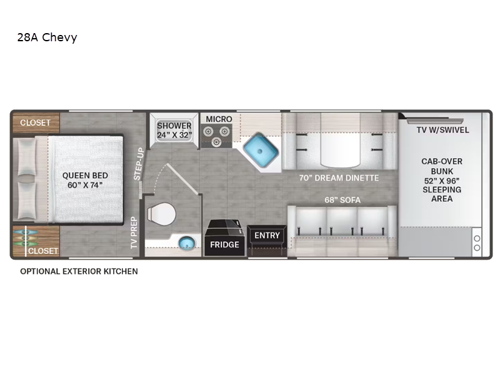 Experience the open road like never before with the 2024 Thor Motor Coach Chateau 28A. This versatile RV is designed with comfort and convenience in mind, making it the perfect choice for families or groups of up to eight. Its spacious interior features a cozy front living area, complete with a 70" dream dinette and a 68" sofa, perfect for relaxing or entertaining. The cab-over bunk offers additional sleeping space, making sure everyone has a comfortable place to rest after a day of adventure. The center kitchen is equipped with a mid-size electric refrigerator and a three-burner cooktop, ensuring you can prepare delicious meals on the go. The rear bedroom offers a queen bed flanked by ample closet space, ensuring you have all the storage you need for extended trips. The center bath, with its shower and curtain, provides all the essentials for freshening up. With a 14 ft. powered retractable awning, you can enjoy the outdoors with ease. Built on a reliable Ford E450 chassis and powered by a robust Vortec V8 engine, this RV is ready to take you wherever your heart desires. For more details or to see this model in person, visit your nearest General RV dealership location!