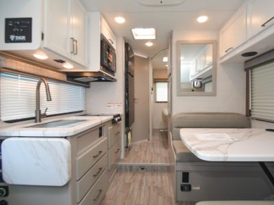 Wherever you decide to travel, you can count on comfort at every turn in this coach! The swivel captains seats can be turned around once you park, and you'll also find seating space on the theater seating with a removable pedestal table. You'll love cooking in the kitchen on the three burner gas cooktop or in the convection microwave with an air fryer. There is also a flip-up countertop for more prep space. A 24" x 32" shower will let you freshen up each day, and the private toilet and sink is right across the hall so two people can utilize the bathroom at once. Head to the rear bedroom that includes a privacy curtain, twin beds with a king bed conversion, and TV prep if you choose to add a television here. With any Pasadena SE Class C Diesel motorhome by Thor Motor Coach, you will find a durable Mercedes-Benz Sprinter chassis and a Mercedes-Benz safety package that includes active braking assist, active lake keeping assist, and more safety features for your peace of mind. The Mercedes-Benz multimedia dash radio is another great feature found on this coach, along with a rearview mirror with a back-up system, a keyless entry system, and an electric step entry with accent lights. There are pressed laminate countertops, residential vinyl flooring, premium window privacy roller shades, and a shower skylight to name a few interior comforts. A 4.0 kW LP generator and 100-watt solar charging system will help keep you powered up, and a Winegard ConnecT 2.0 WiFi/4G/TV antenna will let you stay connected as you camp!