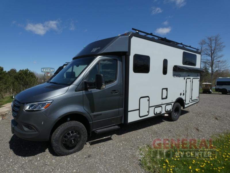 Meet the Winnebago EKKO. This adventure-ready RV combines the efficiencies of a B-Van with the capacity of a Class C motorhome. Built from the ground up for going off the grid, the EKKO has AWD, a 455-watt solar power kit, extensive all-season insulation, and much more so you can go further and camp longer. The massive, heated gear garage with its L-track cargo tie down system allows you to store bikes, inflatable kayaks, fishing rods, and other outdoor gear. Inside, the living area provides all the comforts of home including two twin beds, galley kitchen, and a dry/wet bath with an innovative pivoting wall. This wall swivels to separate the shower from the toilet and sink so you have more room to clean up. Plus, an optional pop-top provides extra sleeping space. Whether you call it a B-Van, B+ motorhome, or anything else, the Winnebago EKKO is everything you need to get anywhere adventure beckons.